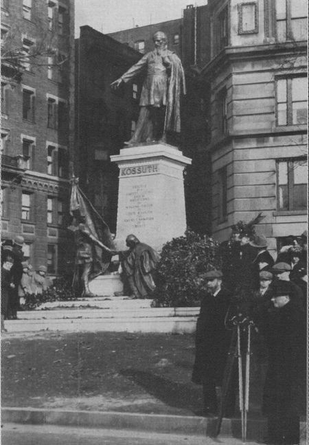 Március idusán, verőfényes tavaszi napon került sor utazásuk legnagyobb eseményére. Három kilométer hosszú menet élén indultak a szoborhoz. A város egyik legszebb terén Amerika, s a világ minden részéről összegyűlt 20000–25000 magyar énekelte a Kossuth nótát. Angol és magyar nyelvű beszédek után, az aradi vértanúk emlékére elsütött 13 ágyú mindent megrázó dörrenése közben, két szép magyar leány — egyikük Magyarország, másikuk az Egyesült Államok megszemélyesítője — közreműködésével hullt le a lepel. Még az ágyúk dörgését is túlharsogta az éljenzés, mely az ércbe öntött Kossuthot köszöntötte. A talapzaton a kormányzó hívó szavára harcba induló fiatal honvéd látványa tárult elő, amint zászlaját előre tartva visszafordul, s utoljára kezet szorít öreg édesapjával. A szabadságharc lelkes hangulata árasztotta el a szíveket.