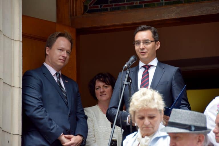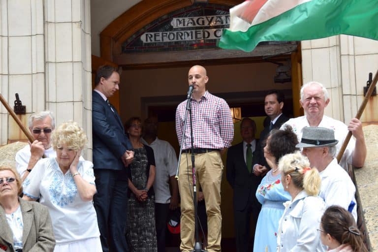 Hajdú Németh Gergely a szervezők nevében üdvözölte a jelenlevőket, majd átadta a szót a fesztivál díszvendégeinek. Elsőként New Brunswick polgármestere James Cahill köszöntő beszéde hangzott el, aki anyai ágon magyar származású és nagy támogatója a helyi magyar közösségnek. Magyarország kormánya is képviseltette magát a fesztiválon, jelen volt Washington DC-ből Szemerkényi Réka nagykövet asszony és Kumin Ferencz nagykövet úr a New Yorki Főkonzulátusról. Ugyan akkor jelen volt Magyarországról Debrecen város polgármestere, dr. Papp László. New Brunswick és Debrecen 25 éve testvérvárosi kapcsolatot tart fent, melyről a következő interjúban kértem a polgármester urat, hogy számoljon be.