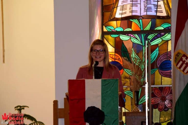 A megemlékezés ünnepi szónoka Lázár Andrea volt, a clevelandi Kapossy Magyar Rádió vezetője és aki maga is ’56-os. Beszédében visszaemlékezett azokra a napokra, mikor családjával menekülniük kellett és felidézte édesapja szavai által a kitört forradalom egy napját.