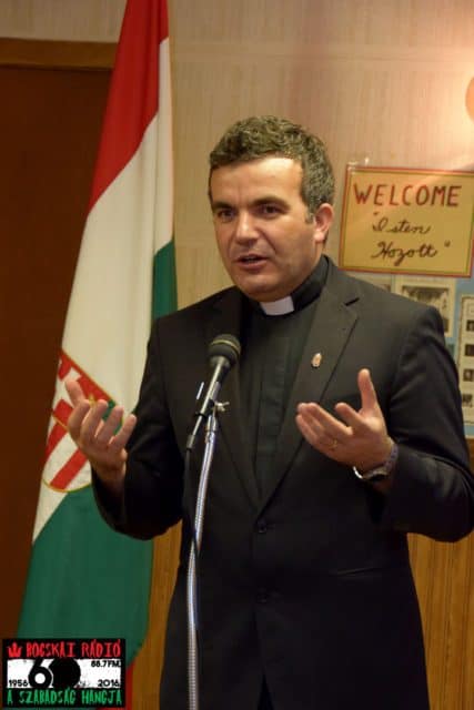 A programot Nt. Tamásy Éva evangélikus lelkész vezette, aki elsőként Mezei András atyát a Szent Imre Római katolikus templom plébánosát szólította a mikrofon elé. András atya imában kért áldást az alkalomra majd gyerekkori emlékeiről beszélt, nagy érzésekkel áthatva, azokról az időkről, amikor tudomására jutott, hogy Trianon miatt tartozik székelyföld Romániához. Visszaemlékezett, hogy az iskolában nem szabadott énekelni a magyar himnuszt és a tanárok nem taníthattak semmit Magyarországról és annak történelméről, mert meg voltak félemlítve. Egy történelem tanárt börtönbe is zártak Ditróban ezért. Beszéde végén kifejtette, hogy nagyon fontos az, hogy itt a diaszpórában is a fiataloknak legyen magyar identitás tudatuk, csatlakozzanak a magyar kultúrának a megőrzéséhez és ne csak a „hedonista fogyasztó-társadalomnak” éljenek.