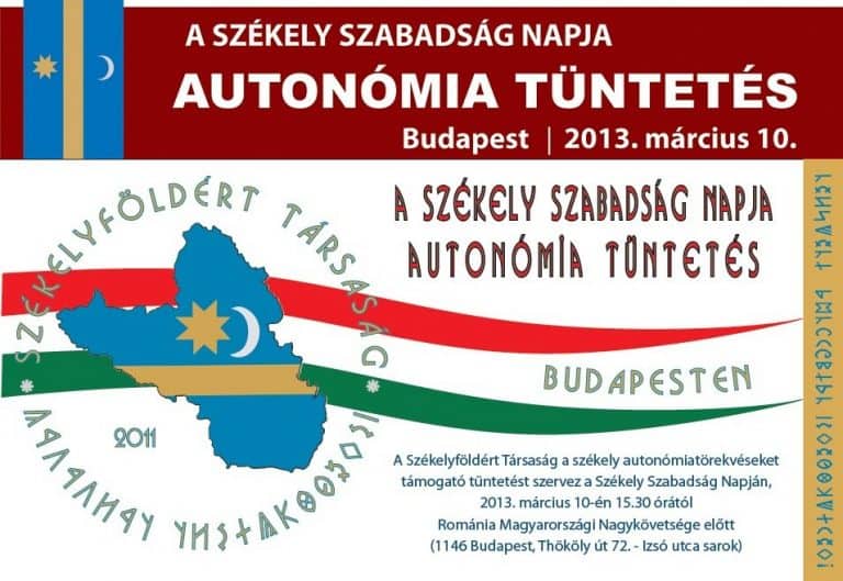 A Székelyföldért Társaság a székely autonomiatörekvéseket támogató tüntetést szervez a Székely Szabadság Napján, 2013. március 10-én 15:30 órától Románia Magyarországi Nagykövetsége előtt (1146 Budapest, Thököly út 72. – Izsó utca sarok)