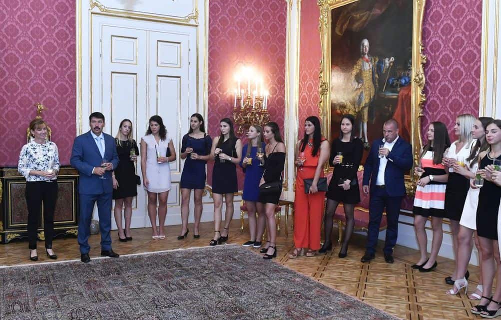Áder János köztársasági elnök hétfő este tiszteletvacsorán fogadta a debreceni junior kézilabda-világbajnokságon aranyérmet szerző női válogatott tagjait és segítőit a Sándor-palotában.