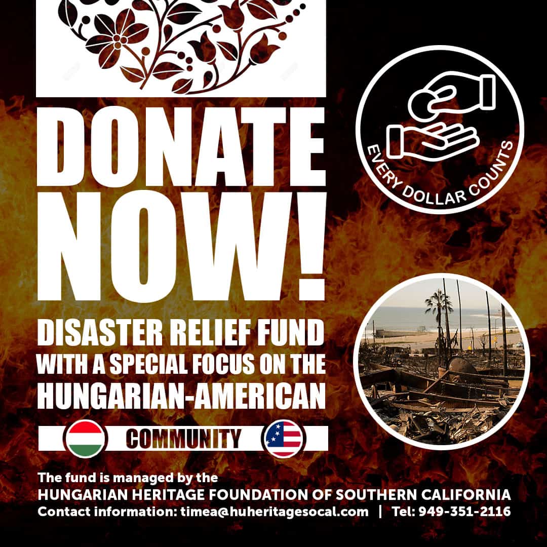 With this purpose in mind, we created the Disaster Relief Fund for the Los Angeles County fire victims with a special focus on the Hungarian-American community. The Disaster Relief Fund is managed by the Hungarian Heritage Foundation of Southern California, a 501 (c) (3) public charity organization. Donations are tax deductible and can be made in the following ways: