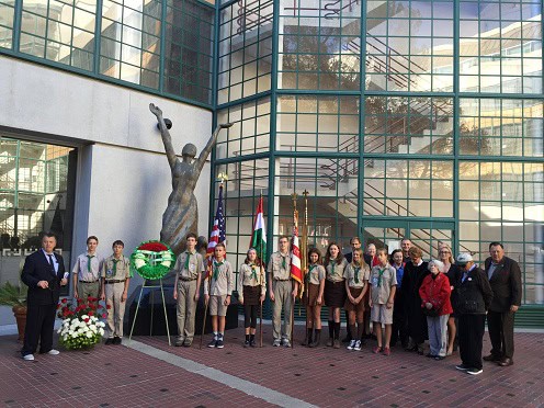 Az Öböl környéki Szabadságharcos Szövetség által szervezett ünnepségen részt vettek a San Franciscoi magyar cserkészek is, valamint Magyari Köpe Gábor református lelkész, aki az Úr áldását kérte az 56-os áldozatokra.