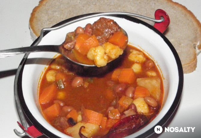 - 1 óra múlva felöntjük 2 liter vízzel, hozzáadjuk a babot (előtte az áztatóvizet leöntjük), a babérlevelet, az erős paprikát. Ha szükséges sózzuk, és még 1 órát főzzük.