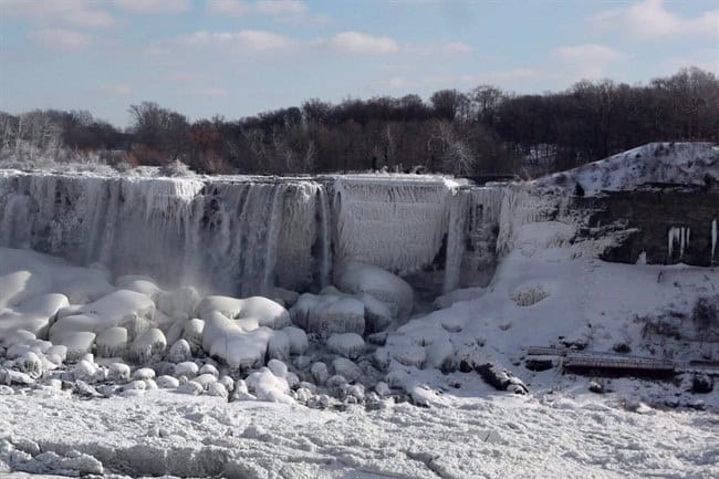 A sarkvidéki hidegben több helyen befagyott a Niagara-vízesés az Egyesült Államok felőli oldalon, rendkívüli látványosságot nyújtva a vállalkozó szellemű látogatóknak.