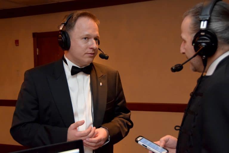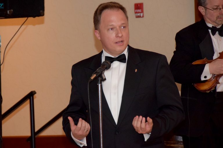 A bál alatt kollegám, Csibi Lóránd a bál díszvédnökével dr. Kumin Ferenc nagykövet úrral készített interjút. Az interjú során Lóránd, érdeklődött a nagykövetség és a cserkészet kapcsolatáról, az eddig elért diplomáciai munka stratégiájáról és eredményeiről. Lóránd továbbá rákérdezett a konzuli munkák helyzetére, ahol az új állampolgársági igénylésekről és a diaszpórai magyarság megőrzésének érdekében történő tevékenységéről kaptunk válaszokat a nagykövet úrtól. A beszélgetés végén magyarországi aktuálpolitikai kérdésekre is kíváncsiak voltunk, ahol a Fidesz utóbbi időközi választások gyengülő eredményeiről faggattuk.