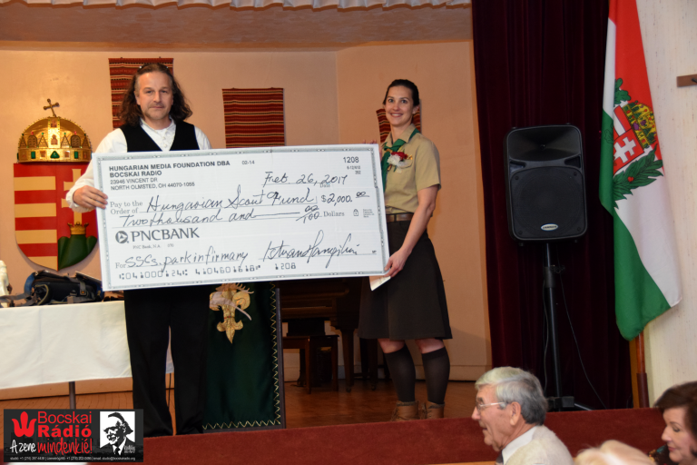 A cserkészebéd során így átadásra került az a “szerény” adomány, amelyet a KMCSSZ tulajdonában lévő Sík Sándor cserkész park gyengélkedőjének újraépítésére szánt a Bocskai Rádió.
