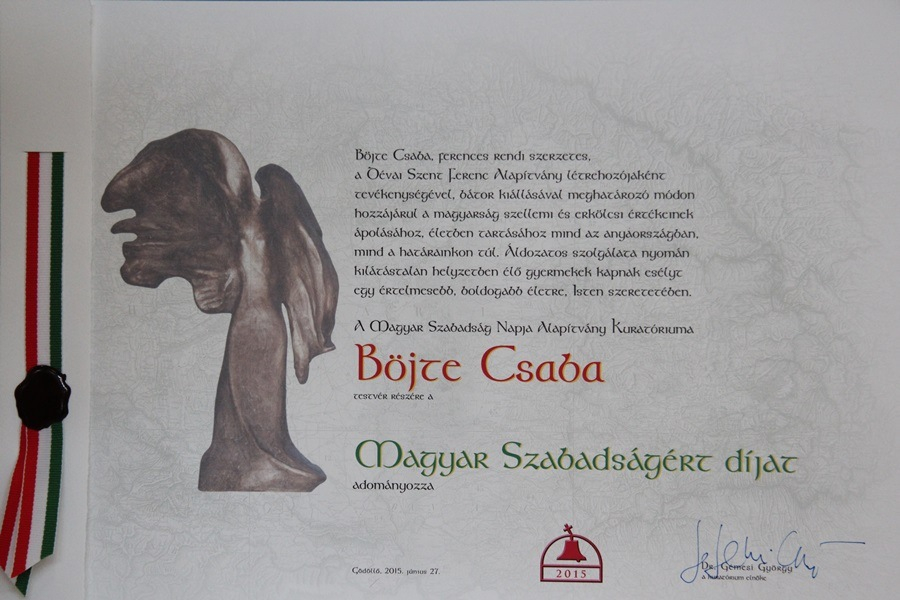 Böjte Csaba ferences szerzetes, a Dévai Szent Ferenc Alapítvány alapítója kapta idén a Magyar Szabadságért díjat. A díjat június 27-én, szombaton a gödöllői Szentháromság templomban adták át – tájékoztat az MTI.