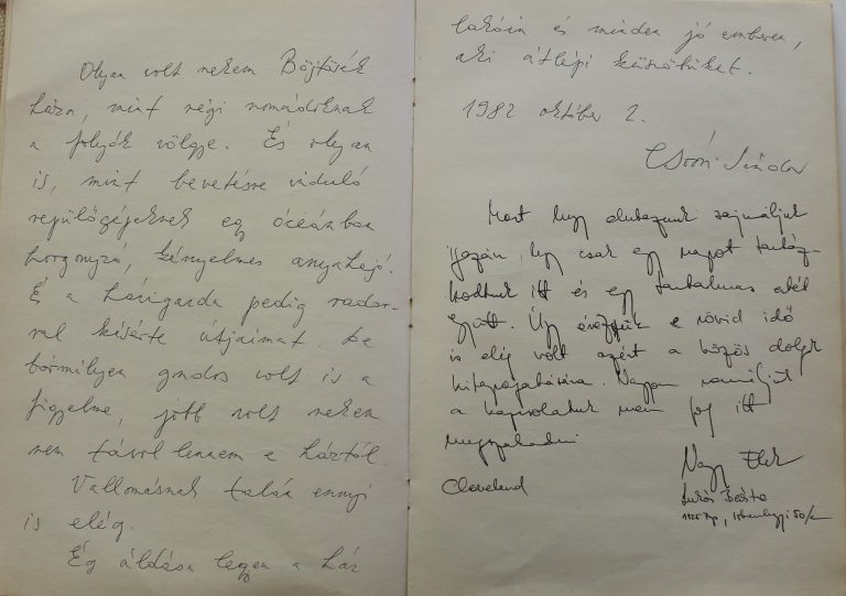 Az alábbi videó egy, a Bőjtös-házaspárnak készített, személyes ajándék. Elsősorban hálám és megbecsülésem kifejezése, de egyben a vendégkönyvek közel háromszáz bejegyzése közül a személyesebb jókívánságok egyfajta válogatott közlése, bemutatása is. Maguk a köszönetnyilvánítások szép illusztrációi egy sokakért sokat tevő házaspár önzetlen munkájának, maguk a vendégkönyvek pedig ugyancsak illusztrációi egy, a hazájától távol élő magyar diaszpóra közösség szellemének és máig tartó tevékenységének.