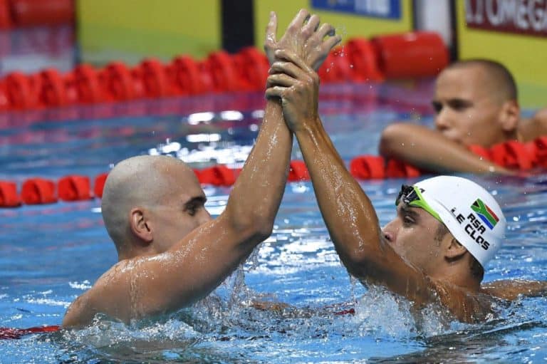 Le a kalappal! Két óriási úszó. Egy dél-afrikai és egy magyar. Ők nyerték (igen, nyerték!) a 200 méteres pillangóúszás döntőjét. Chad Le Clos és Cseh László.