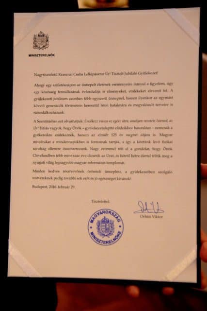 Hoppál Péter a clevelandi református templomban tartott istentiszteletet követően az egyházi közösség dísztermében mondott köszöntőjében méltatta a nyugati világ legnagyobb magyar református katedrálisát építő közösség identitástartását. Köszönetét fejezte ki, hogy a 60 évvel ezelőtti 1956-os magyar forradalom és szabadságharc lángját évtizedeken át őrizték, amíg, mint mondta: „otthon beszélni sem volt szabad róla”. A 200 meghívott részvételével tartott ünnepi alkalmon Hoppál Péter felolvasta Orbán Viktor miniszterelnök személyes hangú köszöntő levelét, melyet átadott Dr. Krasznai Csaba clevelandi református lelkésznek. Krasznai Csaba az Első Magyar Református Egyház 125. évfordulójára megjelent kiadvány előszavában Máté evangéliumára emlékeztetve azt írta: „Az építkezés fontos és szerves része az életünknek. Minden épület esetében létfontosságú az alap, sok mindent meghatároz.” A gyülekezet lelkésze emlékeztetett arra: „1891. május 3-án megalapították az első magyar református gyülekezet Amerikában. A Magyarországról érkezett keresztény református hívek elkezdtek építkezni. Sokuknak saját házuk sem volt még, de először Istennek akartak házat építeni.” Úgy fogalmazott: „Templom alapítóinkat egy belső lelki vágy és erős hit vezérelte, amely a szilárd krisztusi alapba gyökerezett, hogy megalapítsák a magyar református gyülekezetet Cleveland városában.” Magyarország Kormánya idén kiemelt figyelmet szentel a református egyháznak: 2016. február 29-én indította útjára a reformáció 500. évfordulóját ünneplő programsorozatát „Reformáció 500 – a megújulás lendülete” címmel.