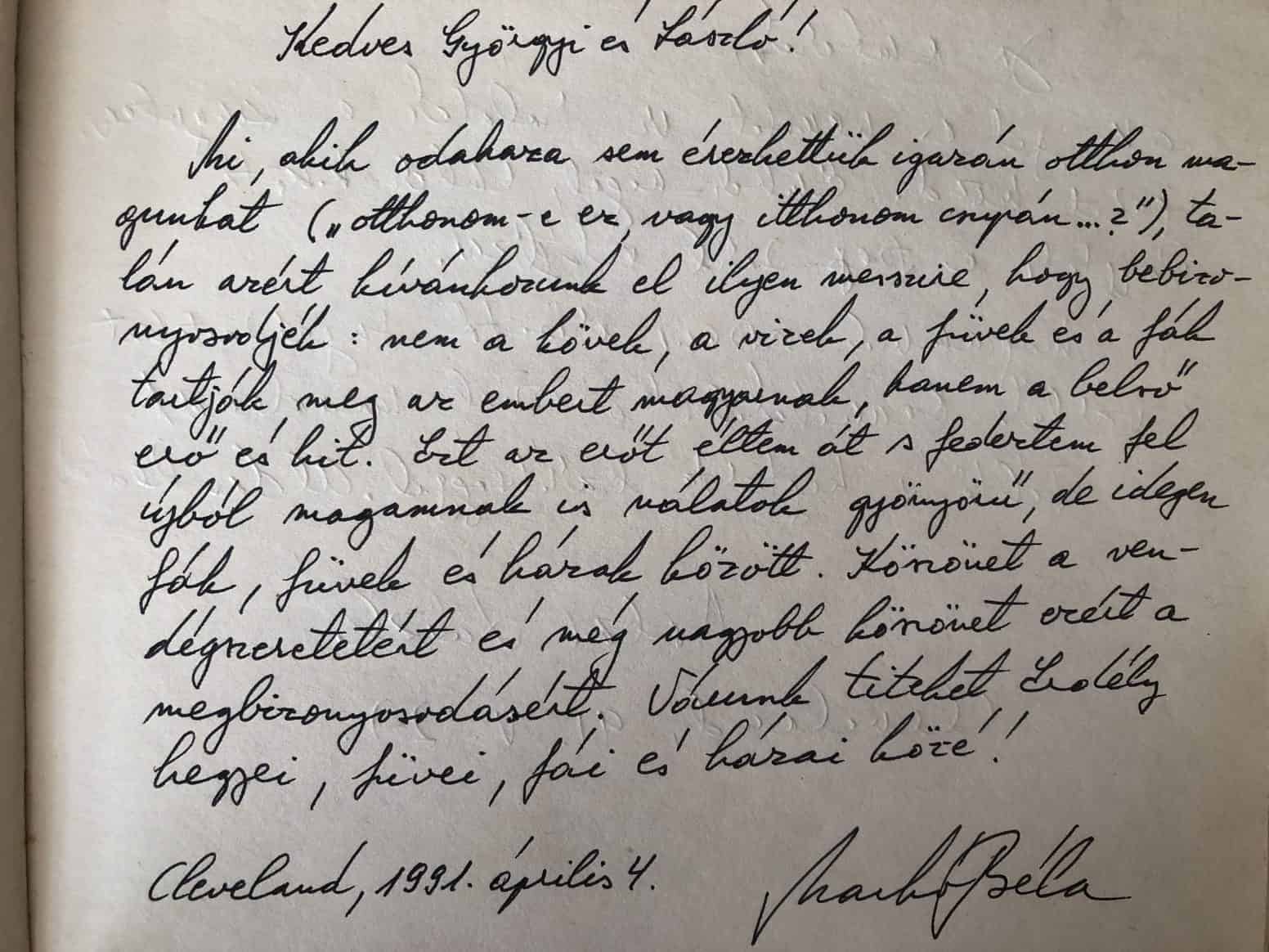 Mi, akik odahaza nem érezhetjük igazán otthon magunkat (“otthonom ez vagy itthonom csupán…?”), talán azért kívánkozunk el ilyen messzire, hogy bebizonyosodjék: nem a kövek, a vizek, a füvek és a fák tartják meg az embert magyarnak, hanem a belső erő és hit. Ezt az erőt éltem át s fedeztem fel újból magamnak is nálatok gyönyörű, de idegen fák, füvek és házak között. Köszönet a vendégszeretetért és még nagyobb köszönet ezért a megbizonyosodásért. Várunk titeket Erdély hegyei, füvei, fái és házai közé!”