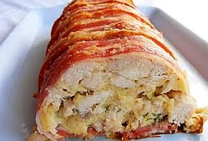 - A baconnal kibélelt formába tegyünk reszelt sajt réteget majd erre kanalazzuk a csirketölteléket, megint reszelt sajt jön rá, utolsó fázisként pedig a túllógó baconszeleteket szépen ráhajtogatjuk.