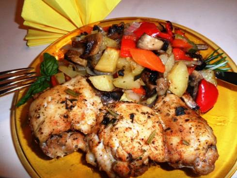 A csirkecombokat bedörzsöljük a fűszerekkel és jókora távolságra egymástól egy nagyon vékonyan kiolajozott tepsibe fektetjük. Közéjük rakjuk a a krumplit és gombát. A csirke tetejére szórjuk a vöröshagymanegyedeket és a fokhagymagerezdeket. 220 fokos sütőben az ételt lassan pirosra sütjük. (Akkor jó, ha a húsba már nagyon könnyedén belemegy a villa.)