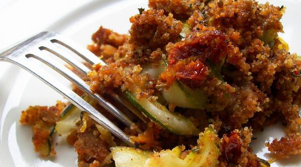 A kenyeret nagyjából 1 cm-es kockákra vágom. 1 evőkanál olívaolajon a zsemlemorzsával együtt világosra pirítom, félreteszem. A napon szárított paradicsomot, ha túlságosan száraz lenne, előzetesen langyos vízbe áztatom, ha megpuhult, vékonyra csíkozom. A cukkinit uborkagyalun legyalulom. A hagymát vékony félkörökre szeletelem.