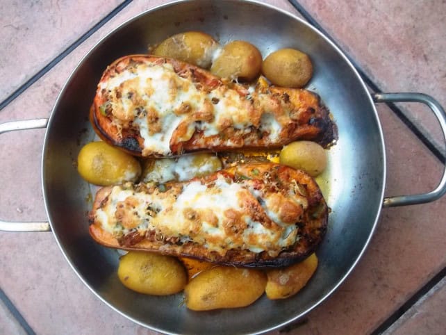 A megpárolt sütőtököt megsózzuk, megborsozzuk, majd megtöltjük a húsos raguval, mellétesszük a krumplikat, majd locsolunk rá olajat. 180 fokon 30 percig sütjük.