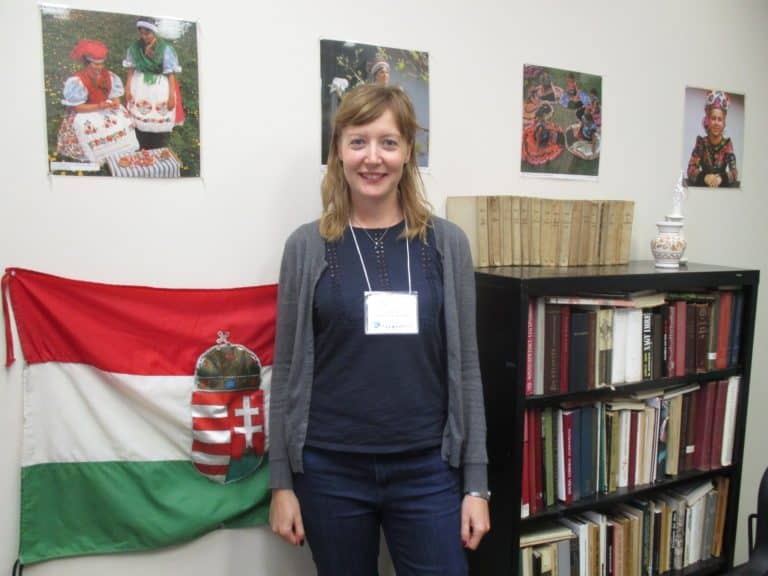 Ritával a tavalyi munkahelyén találkoztam az egyetemen, a magyar tanszéken. A kicsinyke tanszék nagyon otthonosan van berendezve. Magyar néptáncosokról készített gyönyörű fotók díszitik a falakat és természetesen rengeteg magyar nyelvű könyv fedezhető fel a polcokon. Sikerült a tanszék dolgozóinak egy kis Magyarország-hangulatot teremteni .
