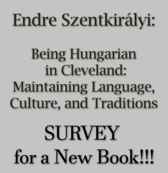 Dr. Szentkirályi Endre új könyvéhez: Being Hungarian in Cleveland: Maintaining Language, Culture, and Traditions, kérjük, hogy mind a két kérdőívet töltse ki. Mind a két felmérés névtelen, nem gyűjt személyes adatokat.