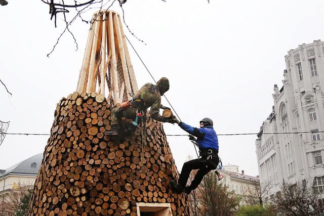 Az Erzsébet téren éppen láttam, amikor az alpinisták kötélen lógva dobálták fel a termetes rönköket, egyre feljebb haladva egy gúla körül. A nem mindennapi látvány egy nem szokványos akciónak köszönhető, aminek különleges eredménye született: a Design Terminál előtt 11 méter magas, 4,5 méter széles karácsonyfa áll, összesen 5000 darab tűzifából.