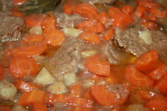 A zsiradékon a hagymát megdinszteljük, majd a marhahússzeleteket rárakjuk és mindkét oldalát átpirítjuk. Rárakjuk a kockára vágott zöldségeket, sózzuk, borsozzuk, belerakjuk a babérlevelet, majd felöntjük vízzel, amennyi éppen ellepi. Fedő alatt húst teljesen puhára pároljuk.