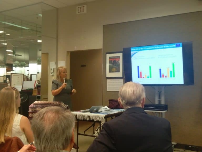 Az előadás elején dr. Papp Klára köszöntötte az egybegyűlteket, akik mintegy harmincan is jelen voltak, majd Ország Éva – az előadó egyik tanítványa bemutatta és méltatta dr. Gabriella Paar-Jaklit, aki előadásával betekintést engedett az Európai Unió működésébe.