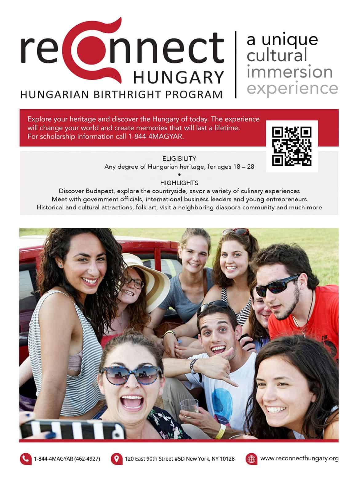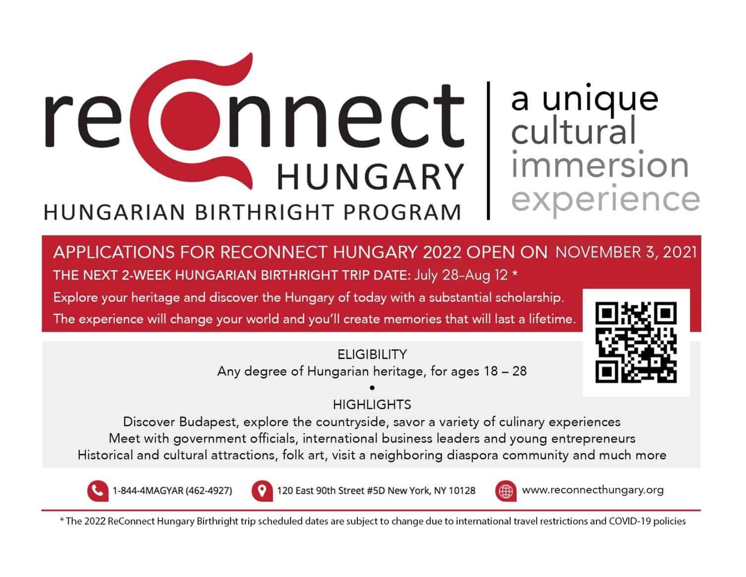 ReConnect Hungary, the Hungarian Birthright Program, is ready to accept applications for the 2022 birthright trip for qualified young adults to participate in its unique cultural, educational and social immersion program. The application period opens November 3, 2021. All those aged 18─28, of any Hungarian ancestry, born in the US or Canada, are invited to apply.