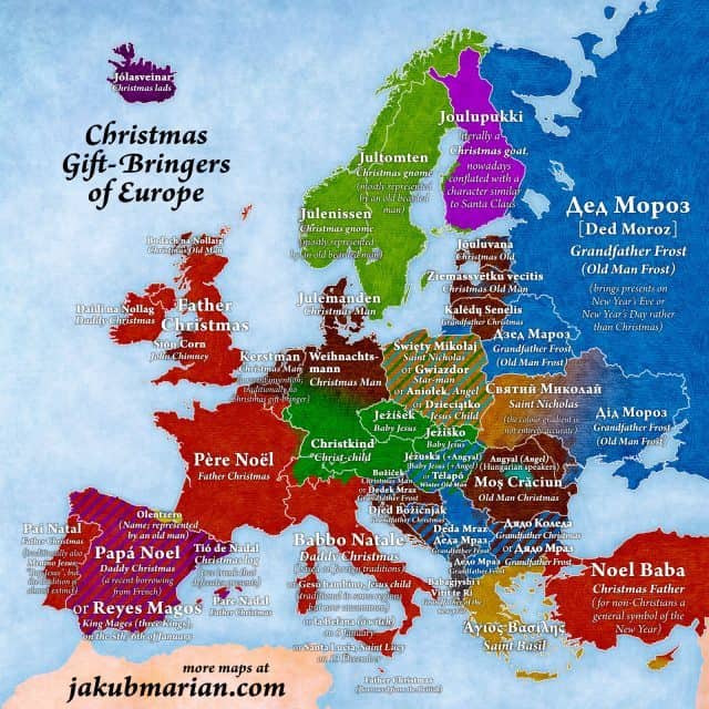 Santa Claus is relentlessly trying to enter our European households (mostly through our mailboxes rather than chimneys), but Father Christmas, Baby Jesus, Grandfather Frost, and other traditional gift-bringers have managed to fend him off so far (well, sort of).