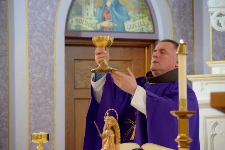 March 22, 2015, became a memorable day for the Cleveland Hungarian community. Father Csaba Böjte, Franciscan priest well known for his charitable work, accompanied by two representatives from the St. Francis Foundation, Dr. Agnes Madarassy and John Csák visited Cleveland, Ohio during their North American tour. They chose St. Emeric Church as the center for the day’s activities, which began with the celebration of Mass at 11 AM. The church was filled to capacity with parishioners, visitors, and guests from the Cleveland area and also from as far as Columbus, Ohio. The Hungarian Scouts also participated, with some members of the Scout Folk Ensemble dressed in the costume of the Szekely region of Transylvania, where Father hails from. Father Csaba’s inspirational homily presented in his unique style focused on the Franciscan’s motto, also known as the prayer of St. Francis, — “Lord, make me an instrument of your peace…” , emphasizing the power of love as Christ taught us when facing challenges and by working together in harmony and peace for the good of others.