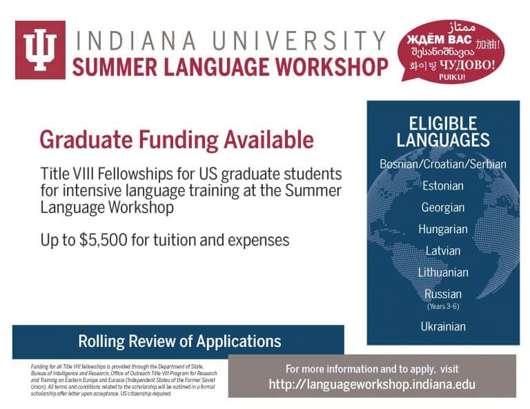 Classes are held on the Indiana University campus in Bloomington, IN, with morning sessions Monday–Friday and extracurricular activities in the afternoons. Program participants earn transferable IU credit and have access to university libraries, recreational facilities, and public transit. On-campus housing is available, but not required. Graduate students, undergraduates, and professionals from the United States and abroad are welcome to participate. No prior language experience required.