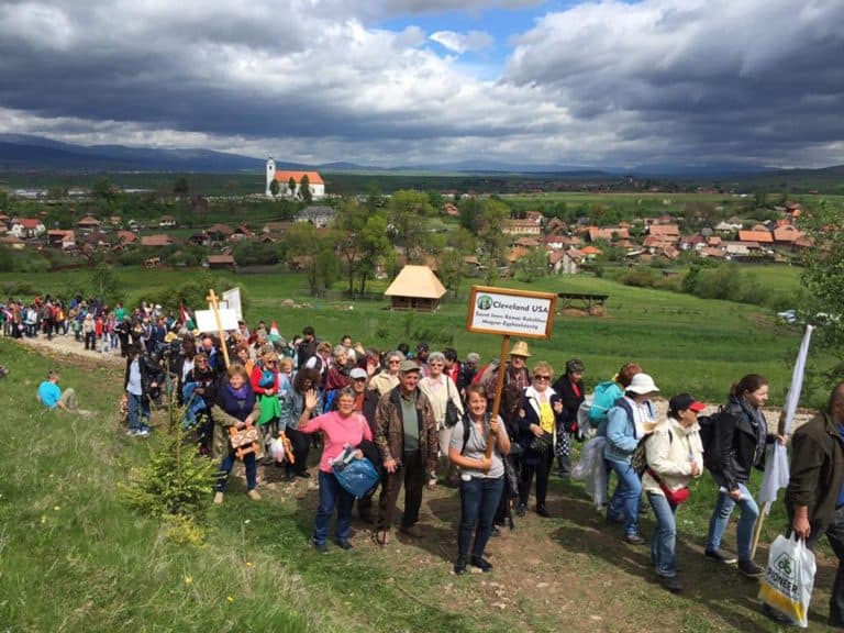 On the day of the pilgrimage, we boarded the bus and hit the road early in the morning knowing that foot traffic would be plentiful. As we neared the town, we noticed more and more pedestrians walking alongside the road, horse drawn wagons filled with people often dressed in traditional Szekely clothing, groups walking with banners and signs detailing the city of their origin and how far they walked – all with smiles on their faces, singing songs and waving as we drove past. There were Hungarian flags on the gates of homes in the villages and a general feeling of openness and welcoming from the town’s people who stood at their doors or waved from their windows.