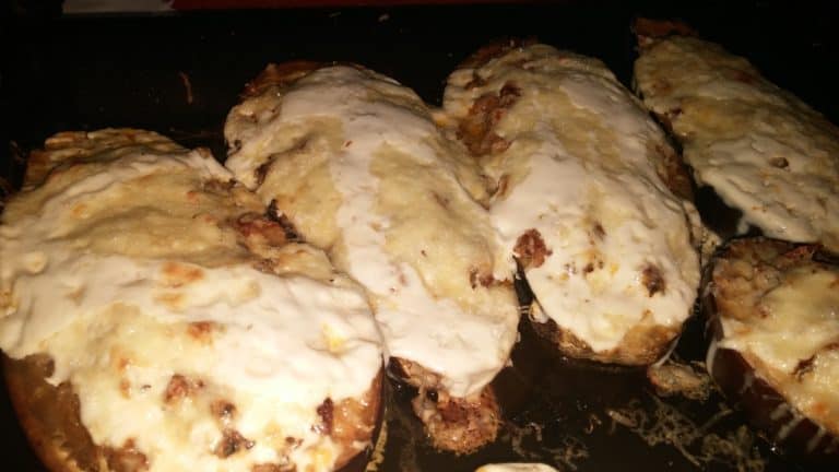 Kevés olajon megfonnyasztjuk az apróra vágott hagymát, a megtört fokhagymát, rátesszük a darált húst és pirítjuk. A paradicsomot forró vízbe tesszük, lehúzzuk a héját és jó apróra összevágjuk az húsát. Rátesszük a darált húsra a kivájt és apróra vágott padlizsán darabokat, a pirospaprikát, a paradicsomot, az apróra vágott petrezselymet vagy bazsalikomot, majd ízlés szerint sózzuk és borsozzuk. Jól összeforraljuk az ízeket és mikor kész szépen belekanalazzuk a kivájt padlizsánokba. Sajtot reszelünk rá leöntjük tejszínnel és . forró sütőben készre sütjük. Akkor jó, ha a sajt a tetején kissé pirult. Kínáljuk rizzsel, de csak úgy egymagában is mennyei eledel!