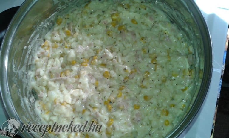 Hozzáadjuk a reszelt sajtot, és jól elkeverjük, hogy elolvadjon benne, majd beletesszük a sonkát és a kukoricát is.