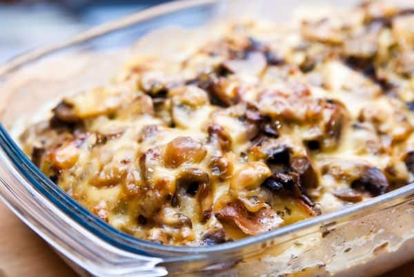 Dinszteljük meg a hagymát és a fokhagymát, dobjuk rá a gombát, sózzuk, borsozzuk, és hagyjuk, hogy engedjen egy kis levet. A félig főtt krumplit hámozzuk meg, vágjuk karikára, majd helyezzük el egy tepsi aljára. A tetején szórjuk szét a gombát, végül locsoljuk le a tejszínnel. Letakarva, 400F fokra előmelegített sütőben süssük kb. 20-30 percig. Vegyük le az aluminium fóliát, szórjuk meg reszelt sajttal, és süssük addig, amíg szépen rápirul a sajt.