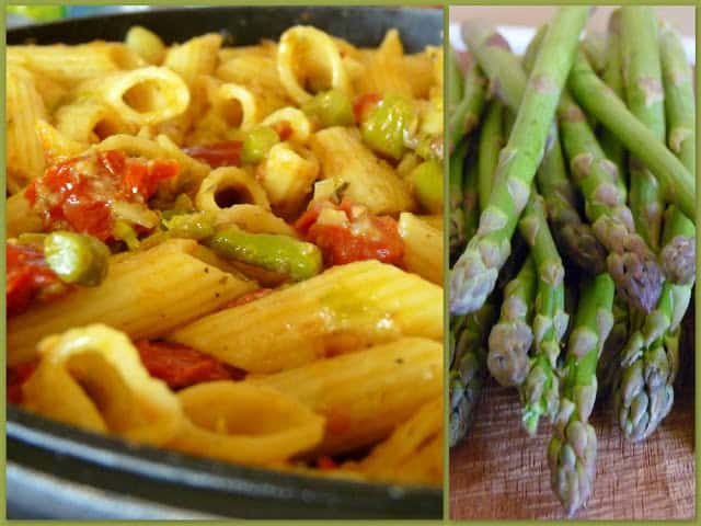 - Egy serpenyőben melegítsünk olajat. Tegyük bele a spárgát és a paradicsomot és kicsit kevergetve süssük 2-3 percig.