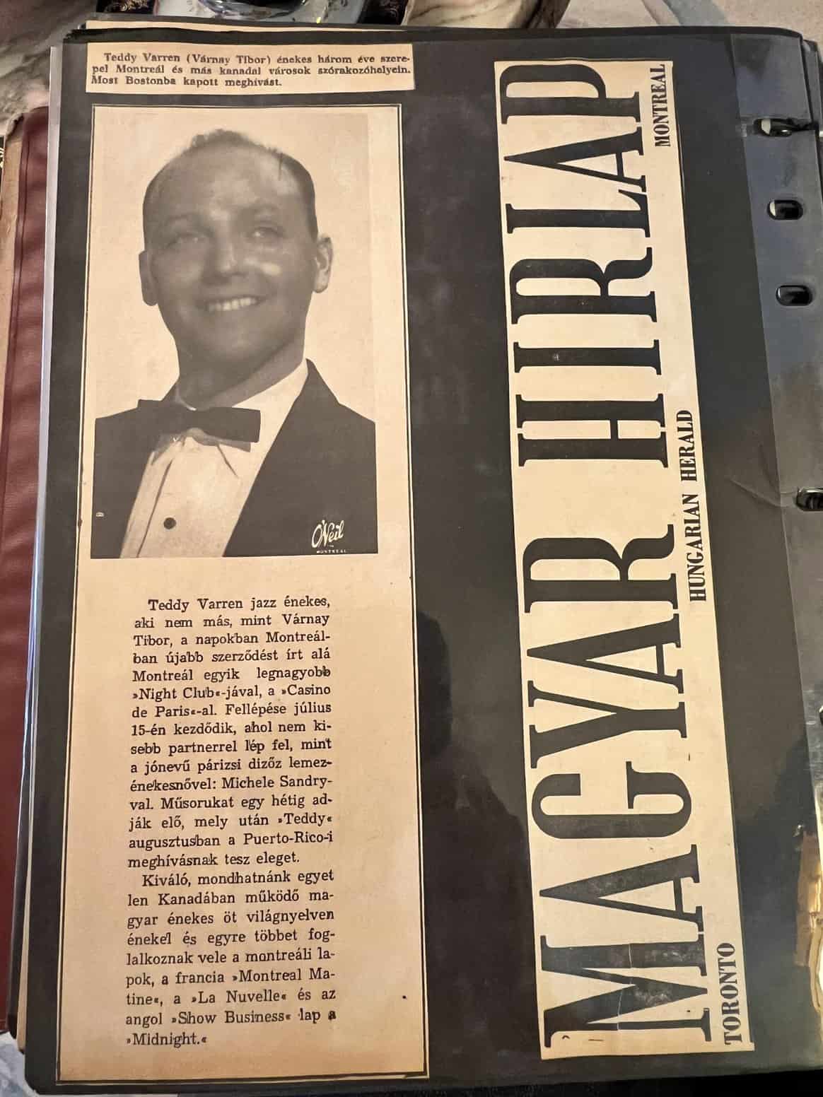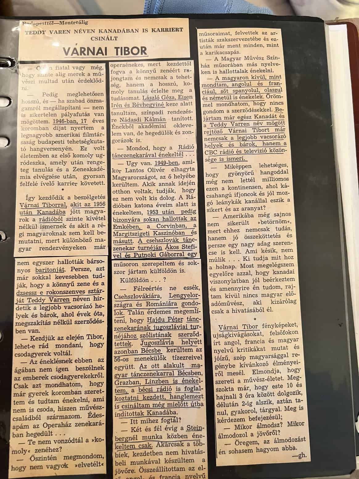 A háború után bementem a Zeneakadémiára, a Semmelweis utcába, ott találkoztam Kodály Zoltánnal is, ott kezdődött az én továbbképzésem. 1950-ben pedig volt egy tehetségkutató verseny Magyarországon, amit négyen nyertünk meg, köztük Záray Márta, így kerültem a Magyar Rádióba. Kanadában még a menekülttáborban megismerkedtem Steve Ness zeneipari impresszárióval, aki először felajánlotta, hogy a háza alagsorában lakhatunk, majd ellátott jó tanácsokkal, és később is sok jó megbízáshoz segített. De először meg kellett tanulnom a nyelvet és el kellett valahogy tartanom a családomat, ezért mindenféle munkát elvállaltam, voltam ácssegéd, szállodai segítő, dohánylevél-szedő egy ültetvényen, majd péksegéd. Közben franciául és angolul is tanultam, hegedűn gyakoroltam, majd a Pearl művésznéven fellépő feleségemmel duót alkotva beutaztuk Quebec tartományt. Volt egy 35 perces műsorunk, mi „melegítettük” fel a közönséget más fellépők előtt. A zeneszámok között Gyöngyi eltáncolt egy-egy hawaii, dél-amerikai és cigánytáncot. Egy ügynökség szervezte a fellépéseket. Így éltem-éltük 1960 és ‘69 között az ún. nightclub életet, s ezt az időszakot követően költöztem Bostonba, immár Doreennal, hogy a Café Budapestben dolgozzak. Ennek előzménye, hogy ‘67-ben Montrealban volt a világkiállítás, és Bán Edit, a Café Budapest tulajdonosa ott hallott engem énekelni és zenélni. Megkérdezte: én vagyok-e az a Várnai Tibor, aki odahaza énekelt a Rádióban, majd elhívott magához dolgozni, nekem viszont épp akkoriban indult egy kétéves szerződésem, ezért csak ‘69 legvégén tudtam Bostonba menni. Tíz éven át dolgoztam nála. Cigányzenét akart, ezért vittem magammal egy cigányprímást és egy cimbalmost, trióban dolgoztunk. Korábban Bostonban nem volt cigányzene, előttünk a Café Budapestben egy olasz hegedűs játszott egyedül. Már az első fellépésünk nagy siker volt, a Boston Herald lap lelkesen üdvözölt minket a bostoni művészvilágban. Azok a hírességek – politikusok, zenészek, milliomosok, Hollywood-sztárok –, akik Bostonba jöttek látogatóba, általában mind a Café Budapestbe jöttek enni, akkoriban ez a város legjobb éttermének számított. Ted Kennedy szenátor például minden hónapban ott volt legalább egyszer és mindig a hatos szeparét kérte. Vacsora előtt vagy után a társaságával átjöttek a bárba zenét hallgatni, ami azért számított különlegesnek, mert általa Európában érezték magukat, és mert akkoriban senki nem játszott cimbalmon. Csikós István cimbalmosnak, akit Montreálból hoztam magammal és aki korábban professzor volt a pozsonyi egyetemen, csodájára jártak, nézték és fényképezték, ahogy zenélt. Az első hat hónapban nagyon jól alakult volt minden, de utána Csikós családi okokra hivatkozva visszament Kanadába, három hónappal később pedig Giulio Whiskey is lelépett. Kerestünk egy zongoristát mellém. Ellen White nagyon jó zenész volt, a legjobb duo voltunk az országban, de mivel mind a négy szünetben megivott egy-egy koktélt, mire a műsor végére értünk éjfélkor, már nagyon lassan játszott a zongorán. Miután ő is leköszönt, váratlanul megjelent Eugene, akit szerintem a Jóisten küldött mellém. A Kirgiz Köztársaságból jött, anyja orvosnő, apja francia professzor volt, ő pedig csodálatosan zongorázott. Sokáig nagyon jó csapat voltunk, alig kellett gyakorolnunk, annyira tehetséges volt, rögtön le tudta játszani, amit tőlem hallott, még a legnehezebb Monti csárdást is. Egy kaliforniai zenei fesztiválon egyszer második díjat nyert.