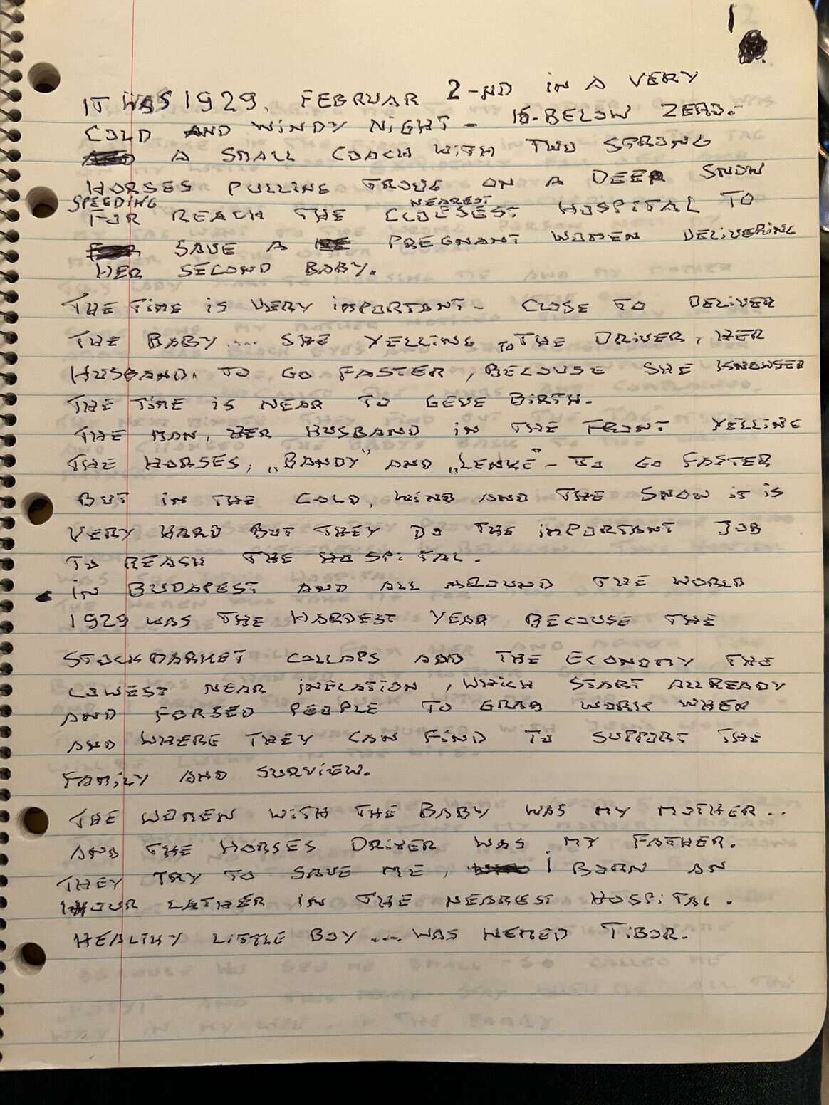 Öt évvel ezelőtt, amikor a feleségem állapota rosszabbra fordult, állandóan azt kérdezte: mi van a könyvvel? Akkor, 90 évesen, elkezdtem a jegyzeteimet összerakni, és leírni kézzel mindent, amire emlékeztem, és aztán átadtam egy kiadónak. Ugyanis már korábban elkezdtem jegyzeteket írni és visszaemlékezni, egészen addig, amikor a cserkészmozgalom alapító R. Baden-Powell („Bi-Pi”) lábán ültem két és fél évesen a gödöllői világdzsemborin, 1933-ban, és egy fotós le is fényképezte a jelenetet. Van egy csoportkép a gimnáziumból, sokakról név szerint tudom, kicsodák. Mindig találtam módot arra, hogy rájöjjek a nevekre. Ha sehogy sem jut eszembe, elkezdem mondani az ABC-t, és egyszer csak beugrik a név. Az agyam még elég jól működik…