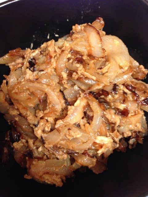 Én most a vegetáriánus, szalonna nélküli verziójának az elkészítését mondom el. A megpucolt hagymákat laskára vágjuk. Egy nagyobb serpenyőbe egy kis olajt öntünk, rátesszük az összes laskára vágott hagymát, sózzuk, borsozzuk, babér-levelezzük és elkezdjük párolni fedő alatt kb. 5 percig. Majd ráöntjük a fehér bort és tovább pároljuk úgy 5 percet, de semmi képp sem addig, amíg szétfő.