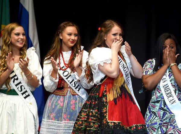 The 2015-2016 Lorain International Princess Olivia Harasty, representing the Hungarian culture, reacts when she hears her name called as queen on Thursday night, June 25.”