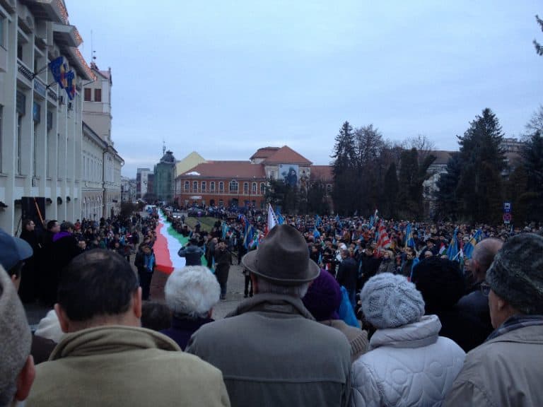 Ezt követően Gazda Zoltán a Székely Nemzeti Tanács Sepsiszéki elnöke magyar nyelven olvasta fel a sepsiszentgyörgyi tiltakozók petícióját. „Elfogadhatatlan hogy Románia kormánya arra használja a hatalmat, hogy elnémítsa, megsemmisítse a kisebbségeket. Az a magatartás, amely üldöz egy kisebbségi nyelvet és szimbólumot, börtönnel fenyegeti a kisebbségi vezetőket, visszaállamosít és uszít az erdélyi magyarság ellen, nem méltó ahhoz a Romániához amely 25 éve lerázta magát a diktatúra láncait és a jogállamiság mellett tette le a voksát”.