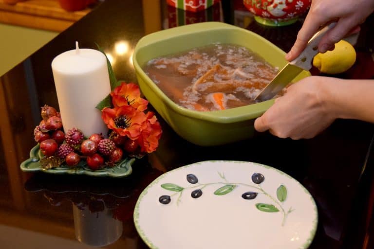 A kocsonyalé tetejéről eltávolítjuk a felesleges zsírt, és rámerjük a tányérba lévő húsra. Jómagam a kocsonya levét átszűröm kávépapíron, mert az nagyon megtísztitja a kocsonya levét és a szírt is visszafogja.