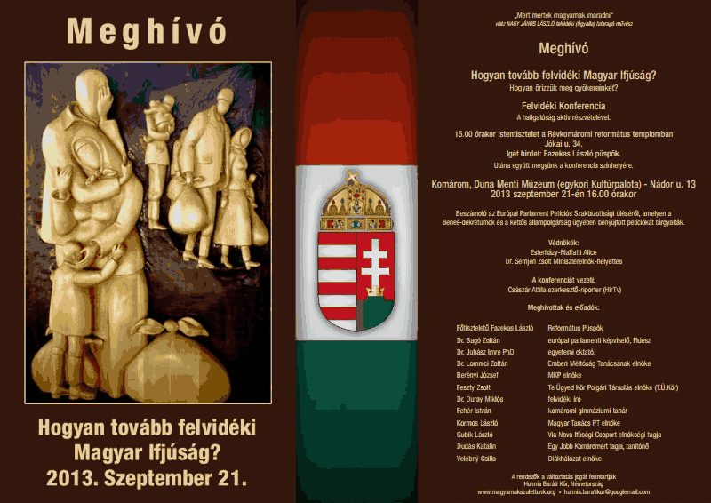 A konferencián beszámolót hallhatunk az Európai Parlament Petíciós Szakbizottsági üléséről, amelyen a Beneš-dekrétumok és a kettős állampolgárság ügyében benyújtott petíciókat tárgyalták. A múzeum dísztermében azonban mindenekelőtt a „Hogyan őrizzük meg gyökereinket?” kérdésre adott válaszlehetőségekről lesz szó. A konferencia meghívott vendégei és előadói: Főtiszteletű Fazekas László református püspök, Dr. Bagó Zoltán európai parlamenti képviselő (Fidesz), Dr. Juhász Imre PhD egyetemi oktató, Dr. Lomnici Zoltán Emberi Méltóság Tanácsának elnöke, Berényi József MKP elnöke, Feszty Zsolt Te Ügyed Kör Polgári Társulás elnöke (T.Ü.Kör), Dr. Duray Miklós felvidéki író, politikus, Fehér István komáromi gimnáziumi tanár, Kormos László Magyar Tanács PT elnöke, Gubík László Via Nova Ifúsági Csoport elnöke, Dudás Katalin tanítónő, a Egy Jobb Komáromért Polgári kezdeményezés tagja, valamint Velebný Csilla, a Diákhálózat elnöke.