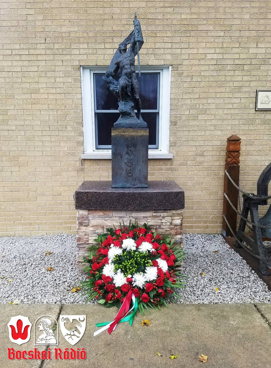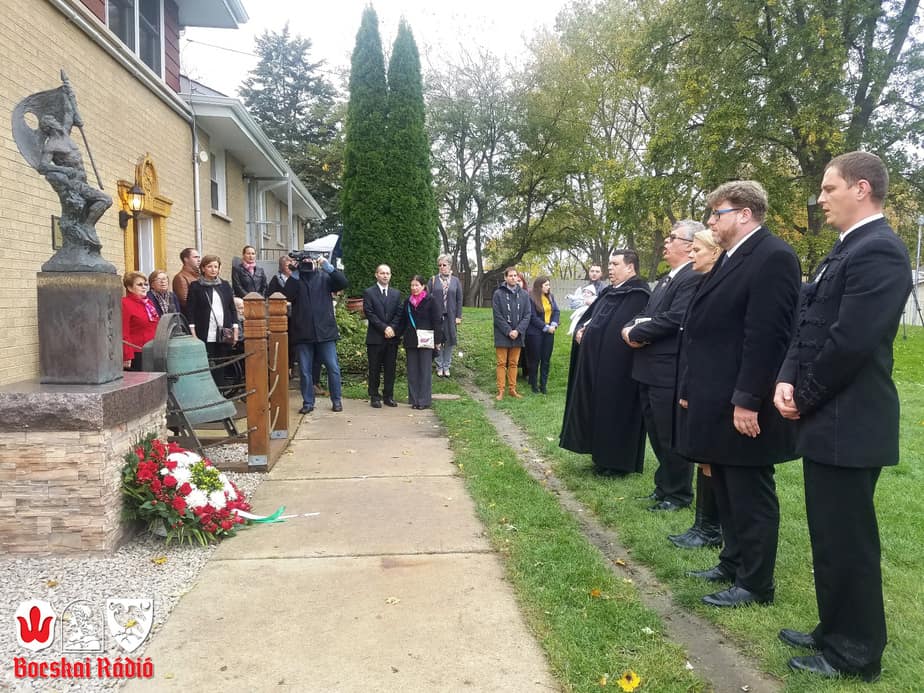 A beszédek után megkoszorúzták Kur Csaba szobrászművész 1956-os emlékművét, amelyet az Akroni Lorántffy Otthon kertjéből hoztak át és avattak fel tavaly a norridge-i templom udvarán a reformáció 500. jubileumának tiszteletére. A megemlékezést a Szózat nyitotta meg és a magyar, valamint a székely himnusz közös éneklése zárta.