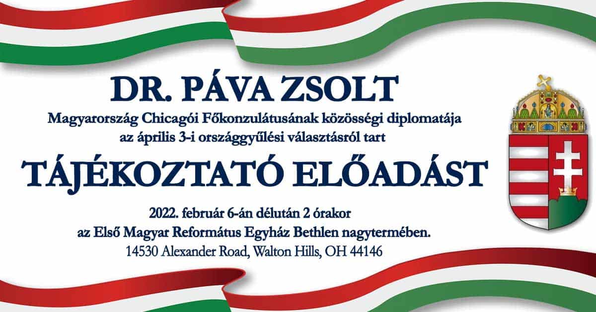 2022. február 6-án délután 2 órakor dr. Páva Zsolt Magyarország Chicagói Főkonzulátusának közösségi diplomatája tájékoztató előadást tart az április 3-i országgyűlési választásról. Minden magyar állampolgárt szeretettel várnak az alkalomra az Első Magyar Református Egyház Bethlen nagytermébe.