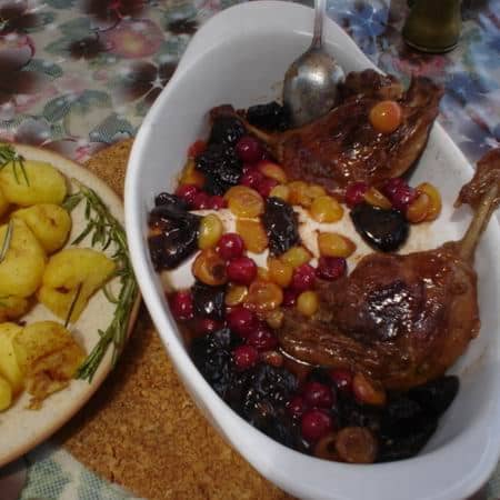 A kacsacombokat felhevített zsiradékon piros-ropogósra sütjük, először a bőrös, majd a húsos felén. Kevés vizet és a bodzaszörpöt aláöntve alacsony hőfokon pároljuk. Az aszalt szilva felét hozzáadjuk, sózzuk, puhulásig lassú tűzön pároljuk.