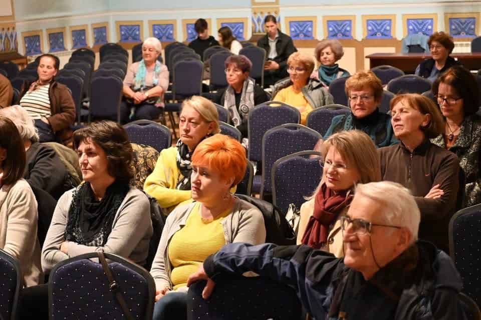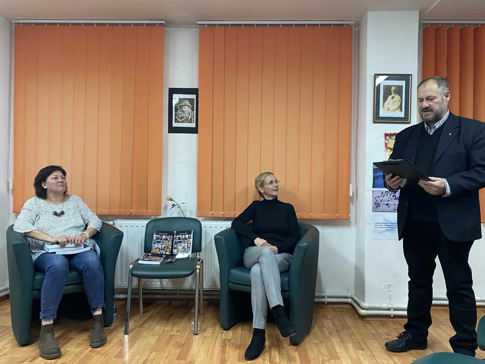 A terem estére ugyan nem telt meg teljesen, de sokan eljöttek, köztük sok régi iskolatárs, illetve azok otthon élő szülei, kedves ismerősök, valamint a téma és a könyvtár programjai iránt érdeklődő ismeretlenek – önmagában már ez is nagy megtiszteltetést és örömet jelentett számomra. Szonda Szabolcs könyvtárigazgató kérésére először magamról beszéltem – hogyan éltem meg annak idején az Erdélyből Magyarországra kerülés okozta kultúrsokkot, az egyetem elvégzése után miért maradtam Budapesten, hogyan alapítottunk az ott megismert férjemmel családot, amivel az egyetemi évek alatt dédelgetett hazaköltözési terveim szétfoszlottak ugyan, viszont azóta otthon érzem magam mindkét országban. Majd arról kérdezett, miként kerültem családommal Amerikában és hogyan lettünk New Jersey államba 2022 nyári érkezésünk óta aktív szereplői a helyi (Passaic/Garfield, New Brunswick és New York) magyar közösségeknek, miért látogattunk el rendszeresen más keleti parti, illetve távolabbi tagállamok és a szövetségi főváros magyar eseményeire is, vagyis hogyan éltük az aktív magyar diaszpóra életet.