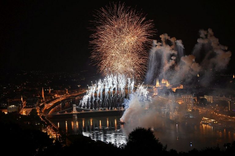 Tûzijáték a 17. vizes világbajnokság megnyitóján a Lánchíd pesti hídfõjénél 2017. július 14-én.
