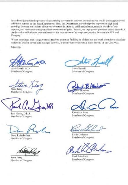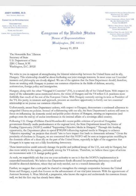 A magyar-amerikai kapcsolatok szorosabbra fűzését és az amerikai külügyminisztérium által a magyarországi vidéki sajtóorgánumok támogatására meghirdetett program azonnali felfüggesztését szorgalmazta Rex Tillerson amerikai külügyminiszternek címzett levelében Andy Harris republikánus párti kongresszusi képviselő és tíz társa.