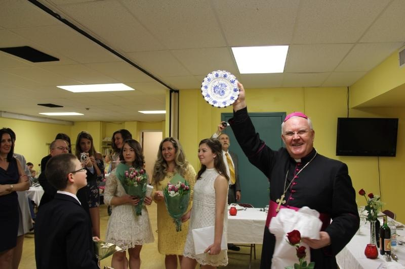 A szentmisét ünnepi fogadás követte az egyházközség új ebédlőjében. A megbérmált fiatalok egy amerikai magyar népművész által készített kerámiatányért ajándékoztak a püspöknek köszönetük jeléül, majd Bálint Dezső, az egyházközségi tanács elnöke mondott köszönetet az ünnepért.