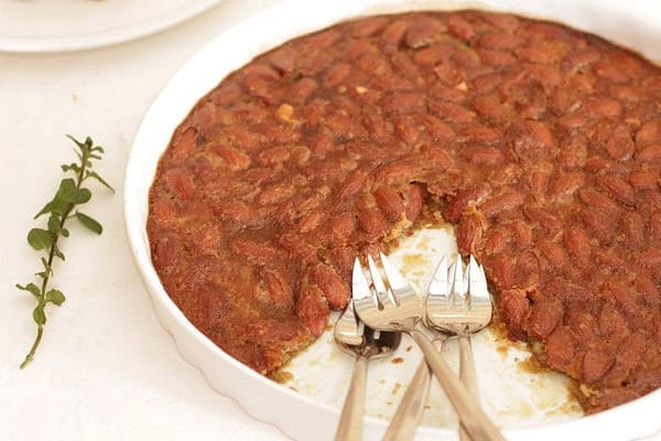 Kivajazott piteformában szétterítjük a mandulát. A maradék hozzávalókat: a mézet, a tojást, a cukrot, az olvasztott vajat és a sót összekeverjük, majd a mandulára öntjük. 385F-fokra előmelegített sütőben 45 perc alatt készre sütjük. Melegen nem fog kijönni a formából, meg kell várni, amíg langyos lesz. Igaz, hogy szépen nem szeletelhető, de nagyon finom, egyszerű és gyors! Tálalható friss eperrel, áfonyával, málnával egy jó kávé mellé, vagy éppen egy pohárka pezsgő mellé is kitűnő.